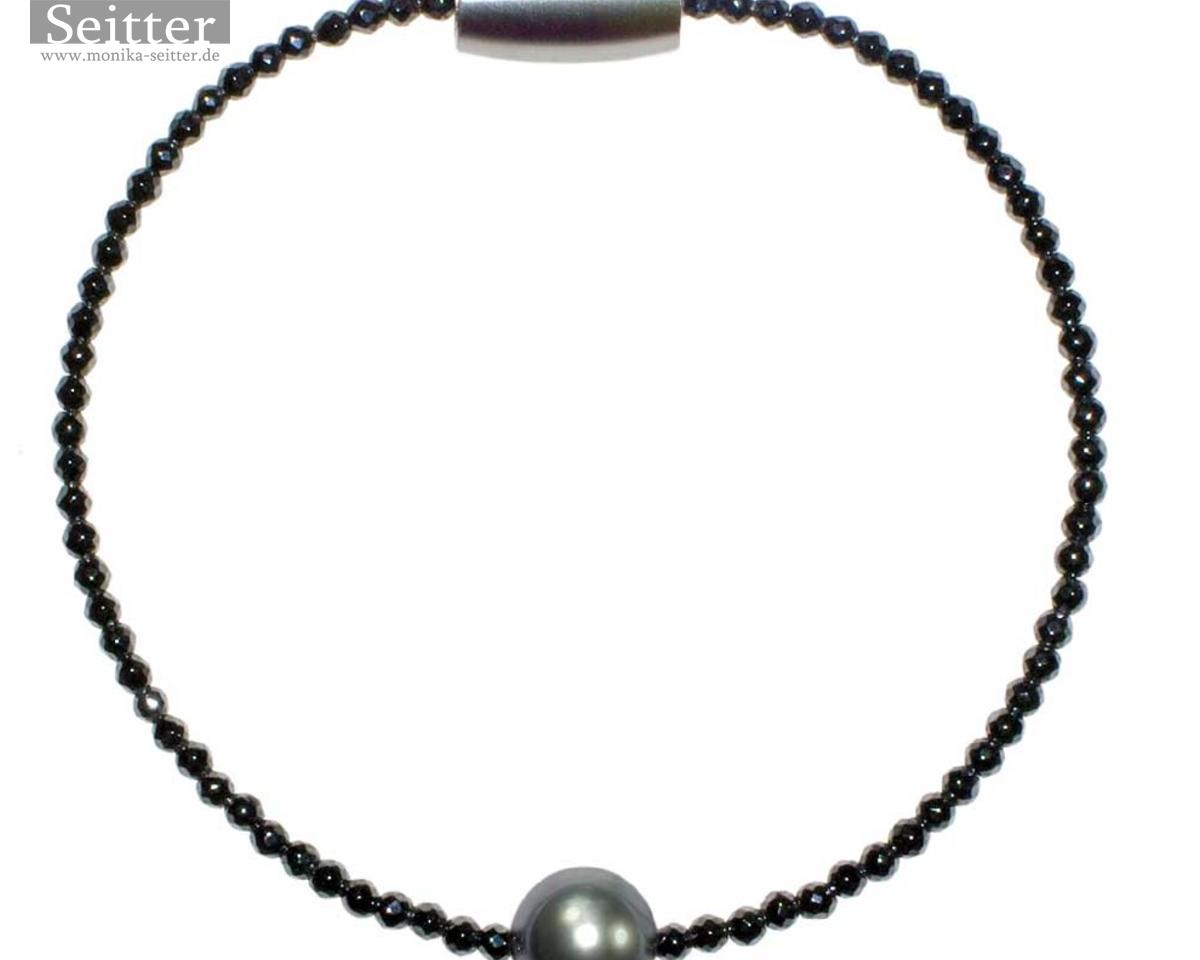 Das quirlige Schmuckangebot von Monika Seitter erhält in diesem Jahr einen dunklen Gegenpart. Für ihre neue Kollektion «Kanaloa» setzt die Düsseldorfer Designerin auf die feinen Nuancen metallisch schimmernder Schwarz- und Grautöne, die sie durch das Wechselspiel von Tahitiperlen und Hämatin -durch verdichteten Hämatitstaub künstlich hergestelltes Hämatit- hervorruft. Durch die filigrane Gestaltung der Hämatinkettchen rücken die Perlen in den Vordergrund. Tahitiperlen geben den Ton an, hier und da setzen weiße Südsee- und Akoyaperlen helle Akzente. Das hawaianische Prinzip von Kanaloa und Kāne entspricht dem chinesischen Yin und Yang, wobei sowohl Kanaloa als auch Yin die schwarze Seite versinnbildlichen.