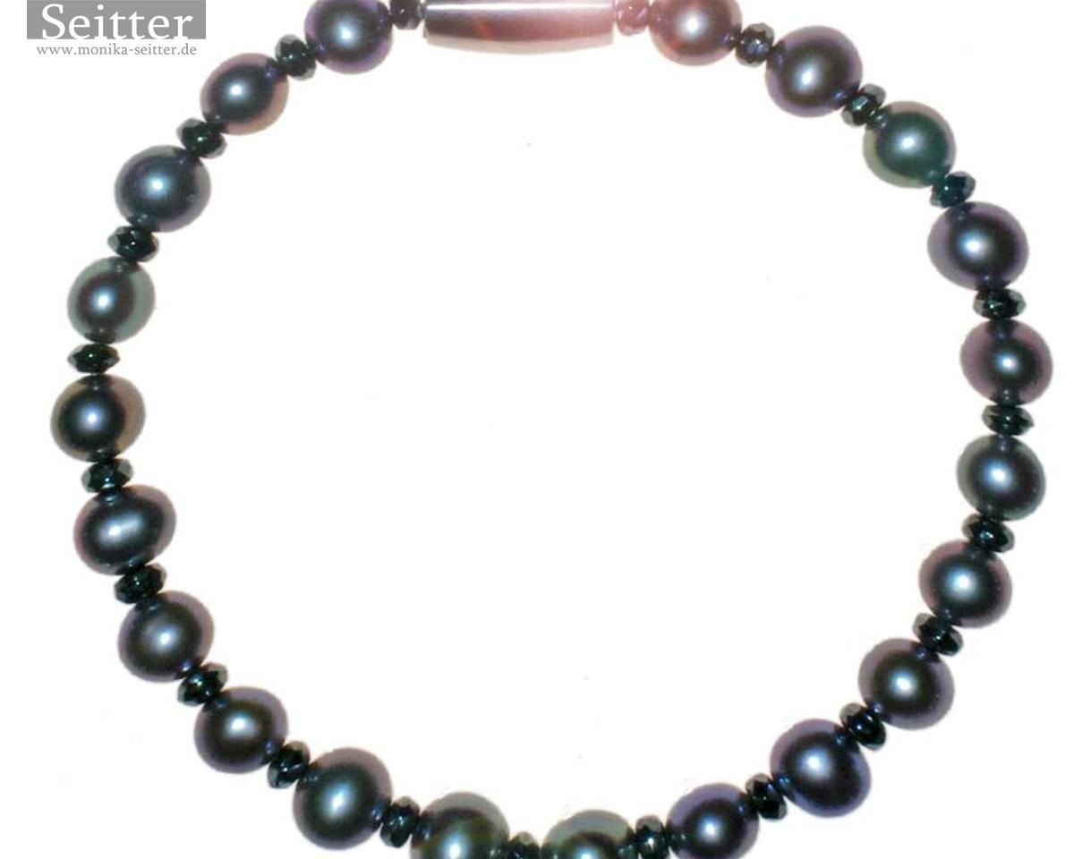 Das quirlige Schmuckangebot von Monika Seitter erhält in diesem Jahr einen dunklen Gegenpart. Für ihre neue Kollektion «Kanaloa» setzt die Düsseldorfer Designerin auf die feinen Nuancen metallisch schimmernder Schwarz- und Grautöne, die sie durch das Wechselspiel von Tahitiperlen und Hämatin -durch verdichteten Hämatitstaub künstlich hergestelltes Hämatit- hervorruft. Durch die filigrane Gestaltung der Hämatinkettchen rücken die Perlen in den Vordergrund. Tahitiperlen geben den Ton an, hier und da setzen weiße Südsee- und Akoyaperlen helle Akzente. Das hawaianische Prinzip von Kanaloa und Kāne entspricht dem chinesischen Yin und Yang, wobei sowohl Kanaloa als auch Yin die schwarze Seite versinnbildlichen.