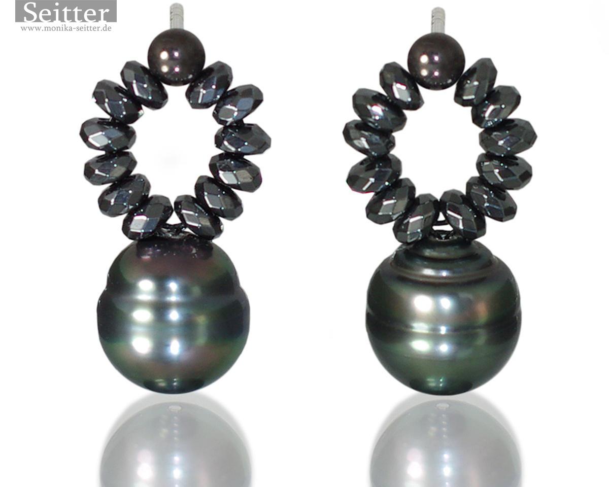 Das quirlige Schmuckangebot von Monika Seitter erhält in diesem Jahr einen dunklen Gegenpart. Für ihre neue Kollektion «Kanaloa» setzt die Düsseldorfer Designerin auf die feinen Nuancen metallisch schimmernder Schwarz- und Grautöne, die sie durch das Wechselspiel von Tahitiperlen und Hämatin -durch verdichteten Hämatitstaub künstlich hergestelltes Hämatit- hervorruft. Durch die filigrane Gestaltung der Hämatinkettchen rücken die Perlen in den Vordergrund. Tahitiperlen geben den Ton an, hier und da setzen weiße Südsee- und Akoyaperlen helle Akzente. Das hawaianische Prinzip von Kanaloa und Kāne entspricht dem chinesischen Yin und Yang, wobei sowohl Kanaloa als auch Yin die schwarze Seite versinnbildlichen.