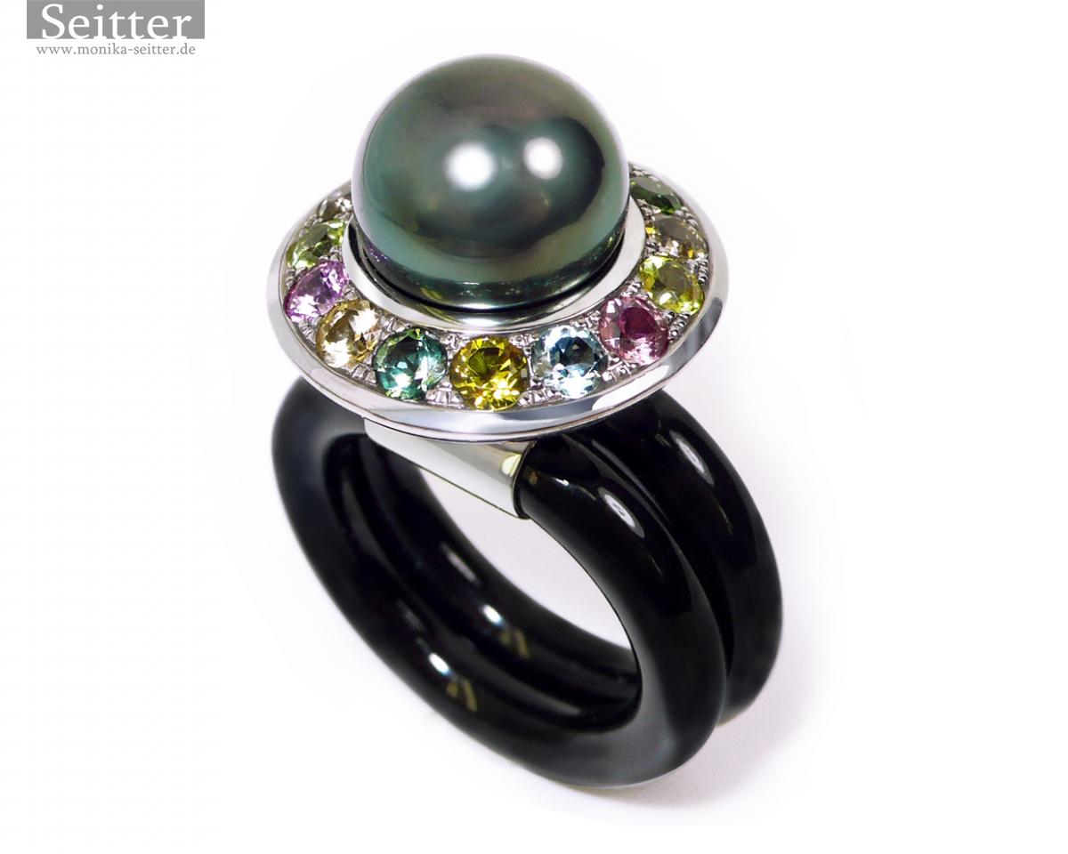 «Bunt ist meine Lieblingsfarbe», sagte einst der Architekt Walter Gropius. Diesen Ausspruch hat sich wohl die junge Designerin Monika Seitter beim Entwerfen ihrer Ringe zu Herzen genommen: Sie kombinierte farbenfrohe Kunststoffspiralen mit edlen Südsee- und Tahitiperlen.