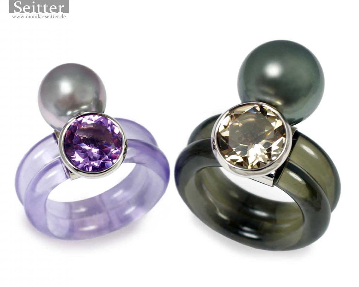 «Bunt ist meine Lieblingsfarbe», sagte einst der Architekt Walter Gropius. Diesen Ausspruch hat sich wohl die junge Designerin Monika Seitter beim Entwerfen ihrer Ringe zu Herzen genommen: Sie kombinierte farbenfrohe Kunststoffspiralen mit edlen Südsee- und Tahitiperlen.