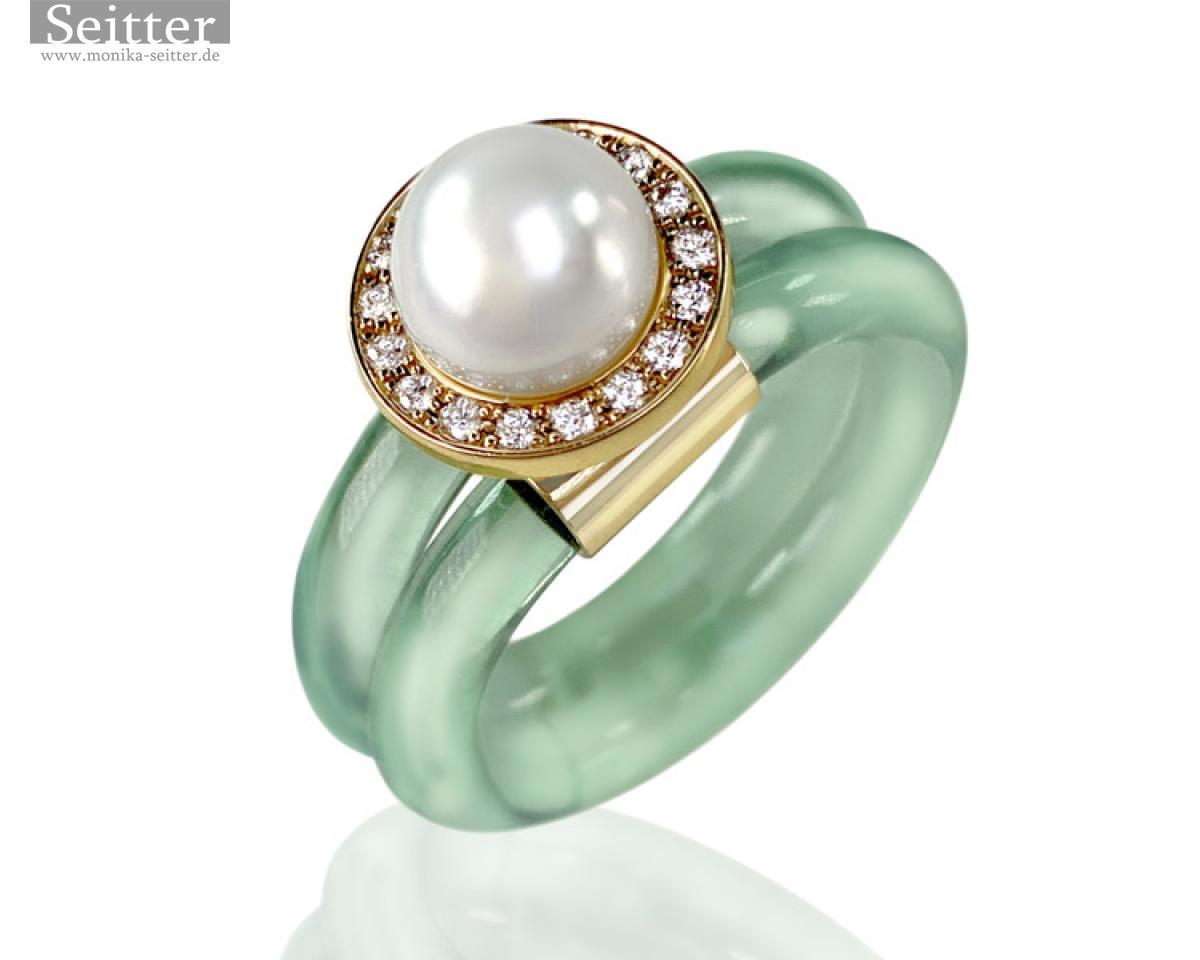 «Bunt ist meine Lieblingsfarbe», sagte einst der Architekt Walter Gropius. Diesen Ausspruch hat sich wohl die junge Designerin Monika Seitter beim Entwerfen ihrer Ringe zu Herzen genommen: Sie kombinierte farbenfrohe Kunststoffspiralen mit edlen Südsee- und Tahitiperlen.