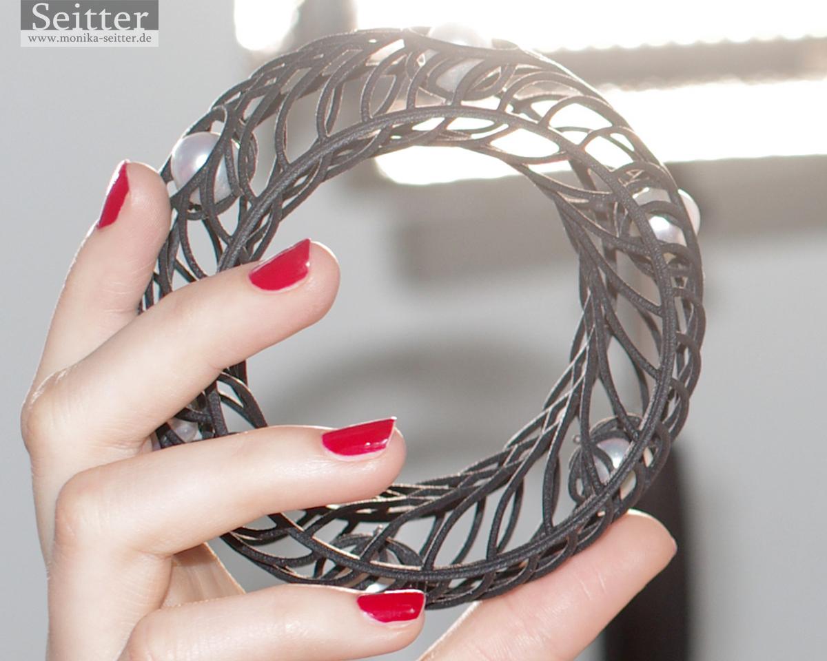 Das Drucken von Schmuck verlangt eine intensive Beschäftigung mit Technik und Material, vor allem aber ist es neben dem Design die Nachbearbeitung, die in den Augen von Monika Seitter den Unterschied macht. Die Oberflächen werden eingefärbt, poliert, versiegelt, Perlen und Edelsteine neu und anders integriert.