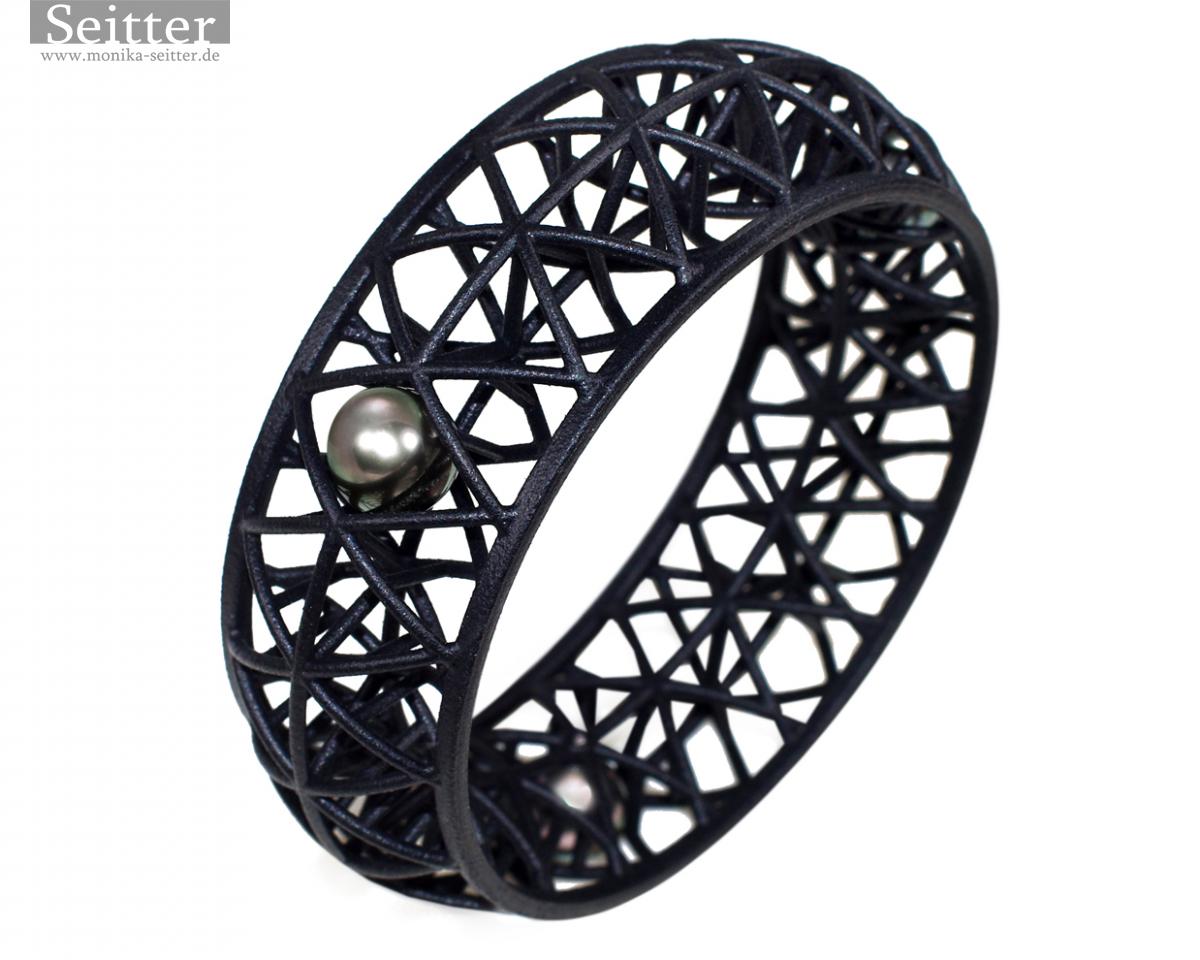 Das Drucken von Schmuck verlangt eine intensive Beschäftigung mit Technik und Material, vor allem aber ist es neben dem Design die Nachbearbeitung, die in den Augen von Monika Seitter den Unterschied macht. Die Oberflächen werden eingefärbt, poliert, versiegelt, Perlen und Edelsteine neu und anders integriert.