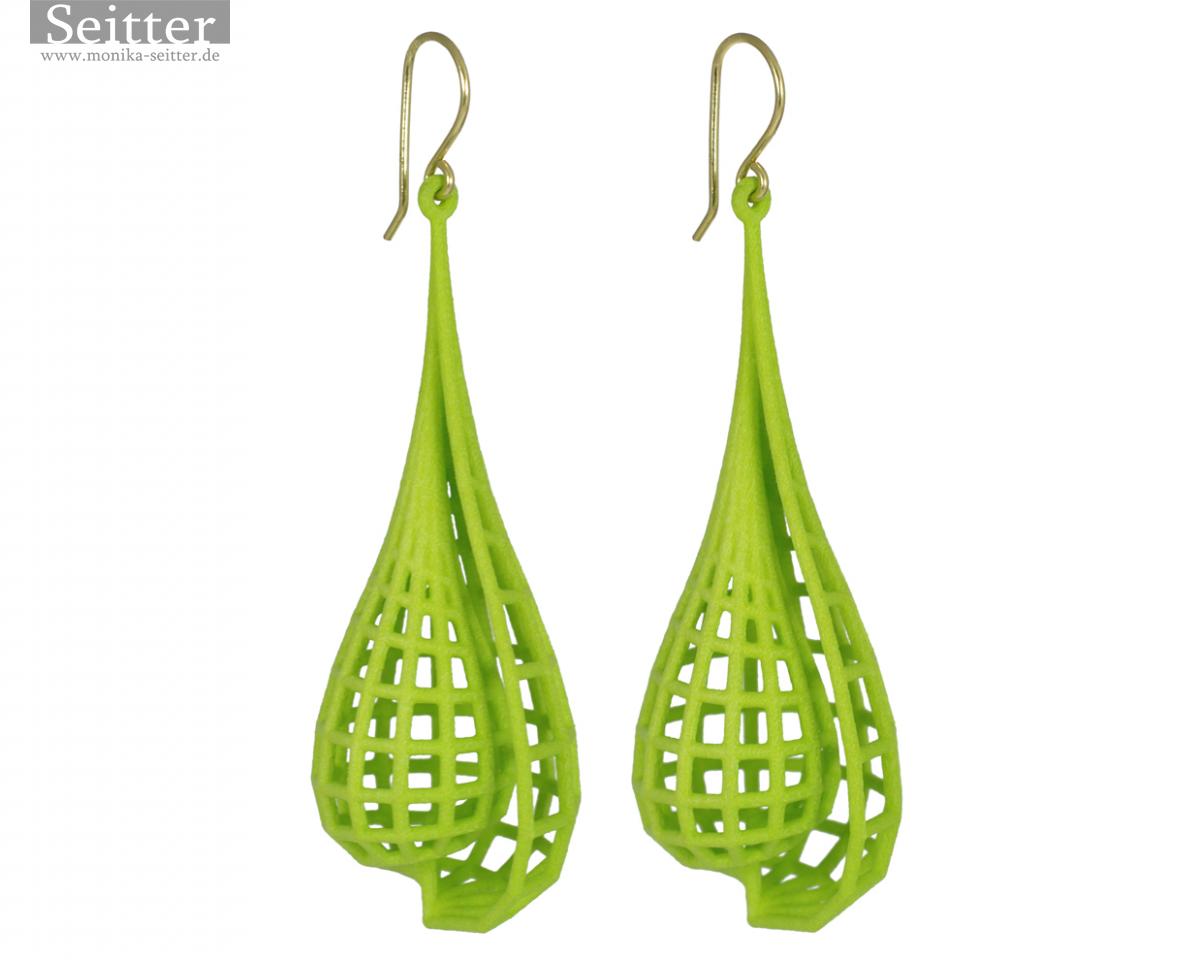 Das Drucken von Schmuck verlangt eine intensive Beschäftigung mit Technik und Material, vor allem aber ist es neben dem Design die Nachbearbeitung, die in den Augen von Monika Seitter den Unterschied macht. Die Oberflächen werden eingefärbt, poliert, versiegelt, Perlen und Edelsteine neu und anders integriert.