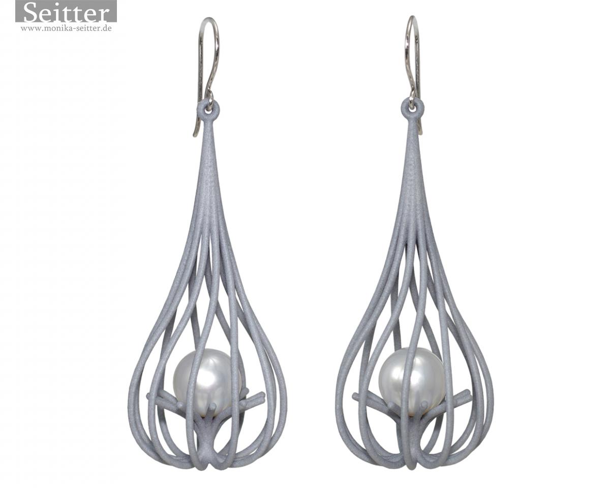 Das Drucken von Schmuck verlangt eine intensive Beschäftigung mit Technik und Material, vor allem aber ist es neben dem Design die Nachbearbeitung, die in den Augen von Monika Seitter den Unterschied macht. Die Oberflächen werden eingefärbt, poliert, versiegelt, Perlen und Edelsteine neu und anders integriert.